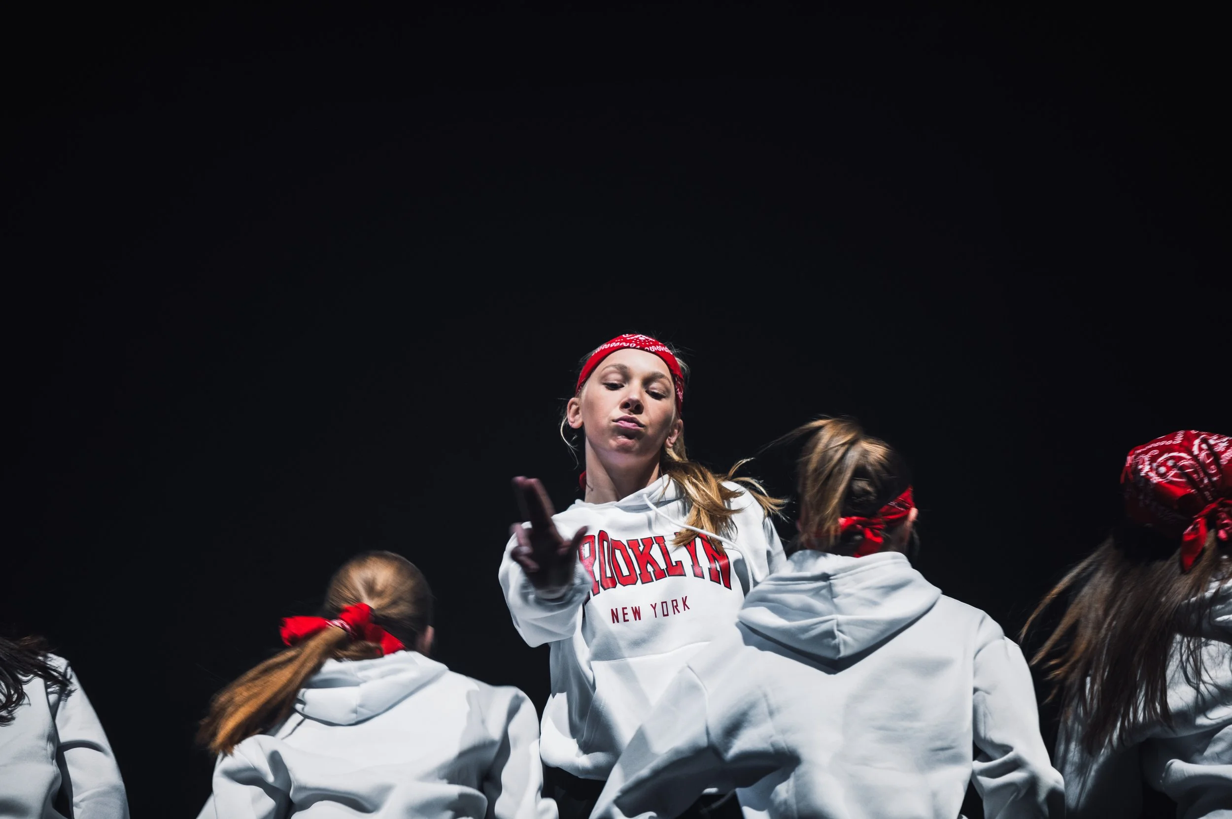 Group of dancers wearing red bandanas and white hoodies with "Brooklyn New York" text, performing on stage.