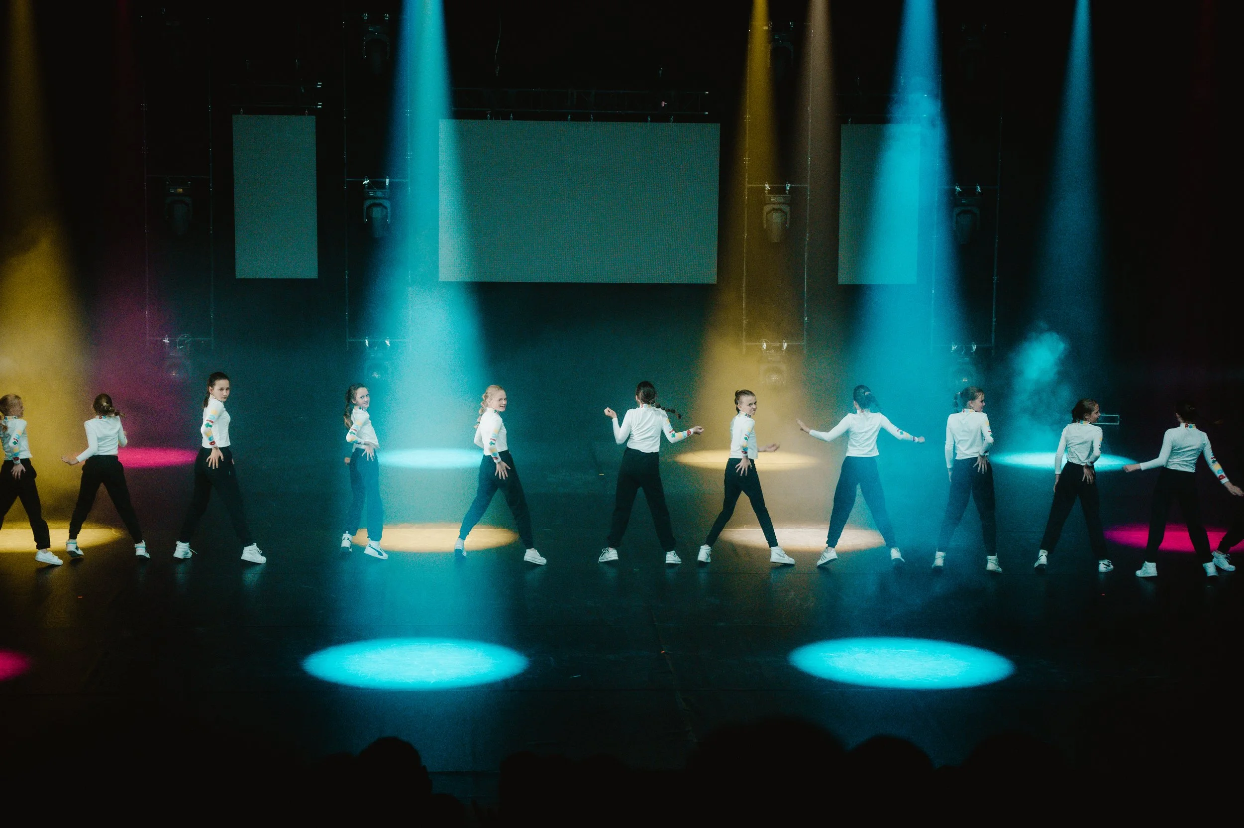 Group of dancers performing on stage with colorful spotlights