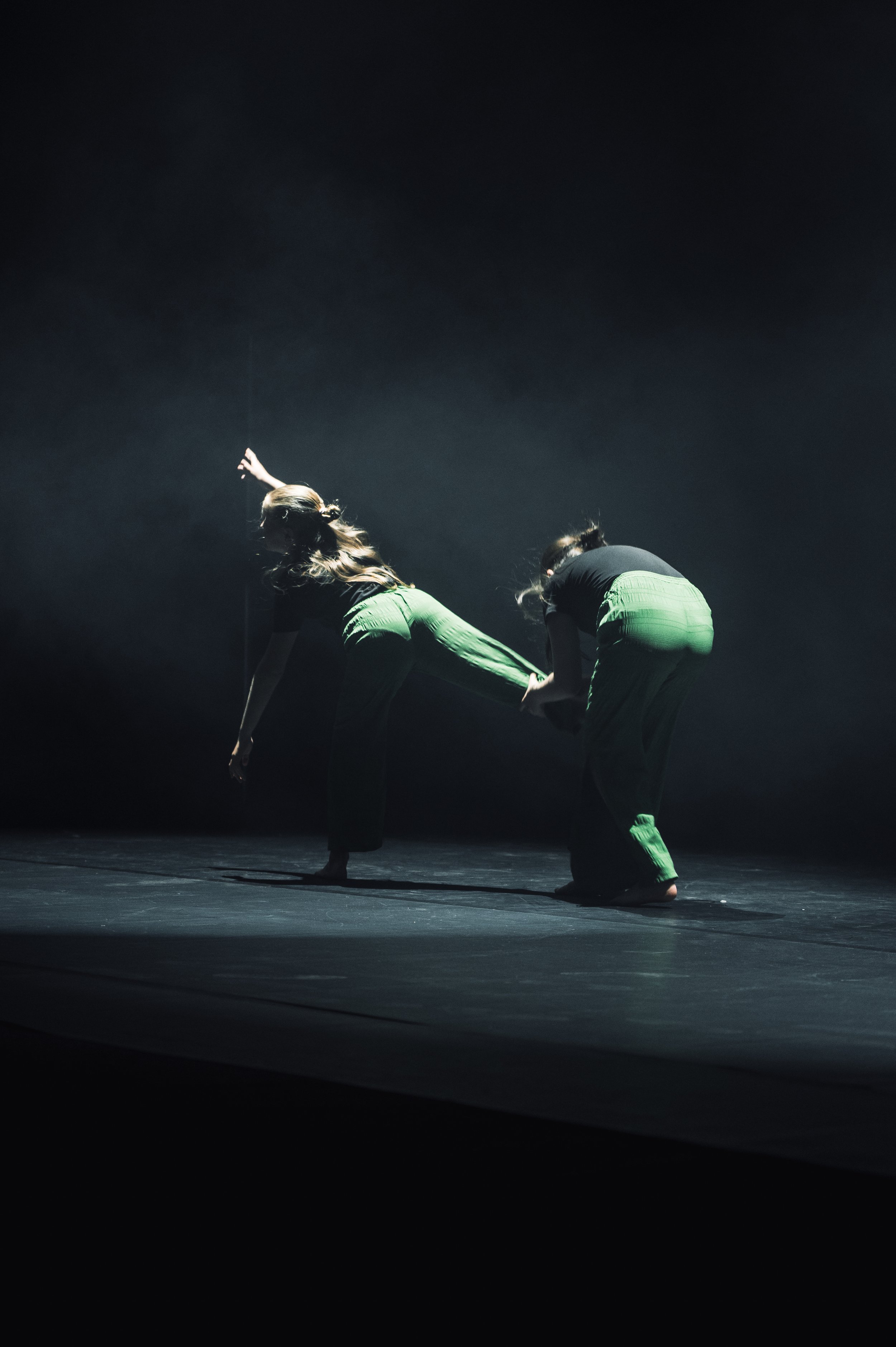 Two dancers in green pants performing on a dimly lit stage.