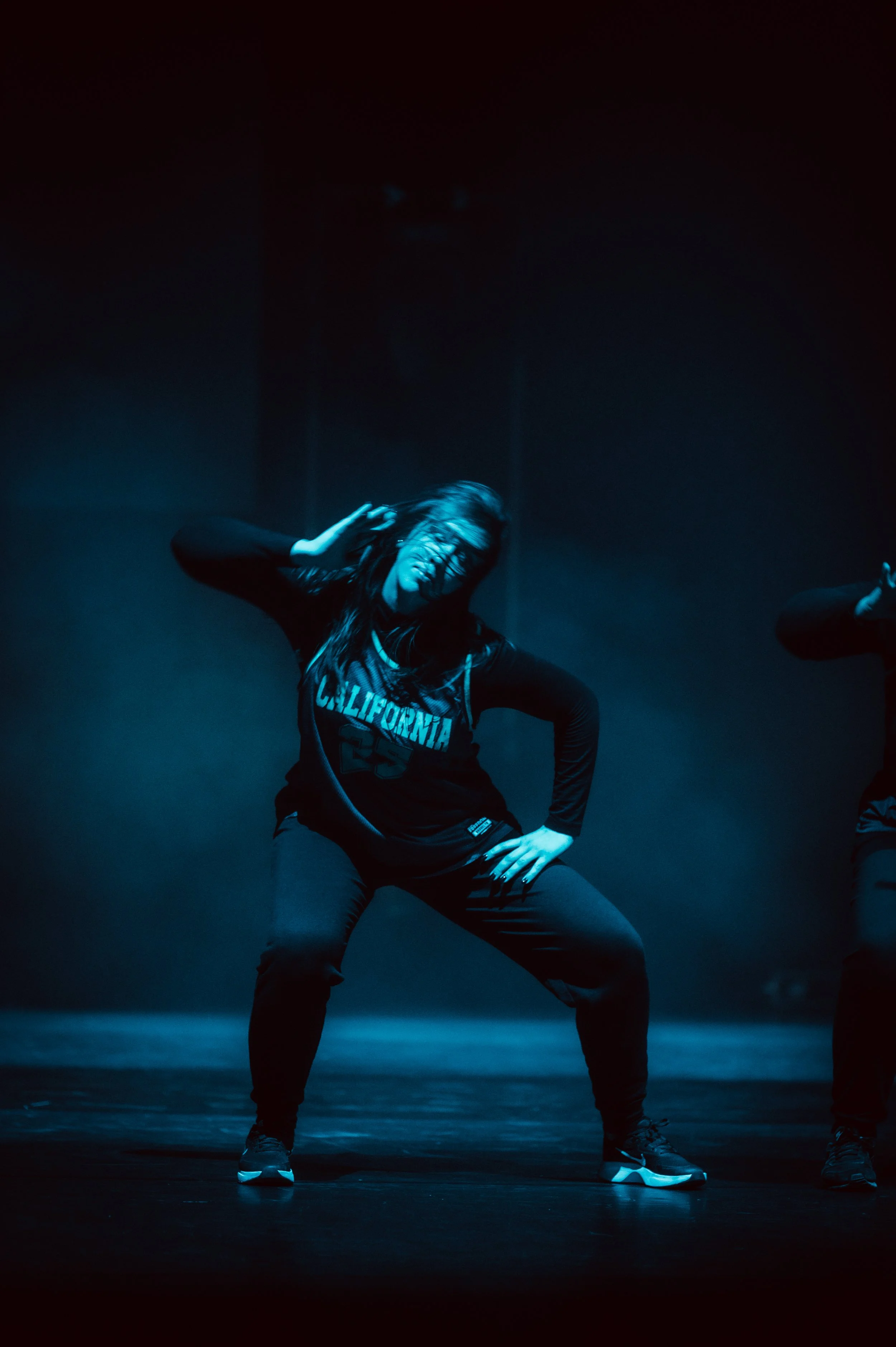Person dancing energetically on a stage under blue lighting, wearing a black outfit and a "California" t-shirt.