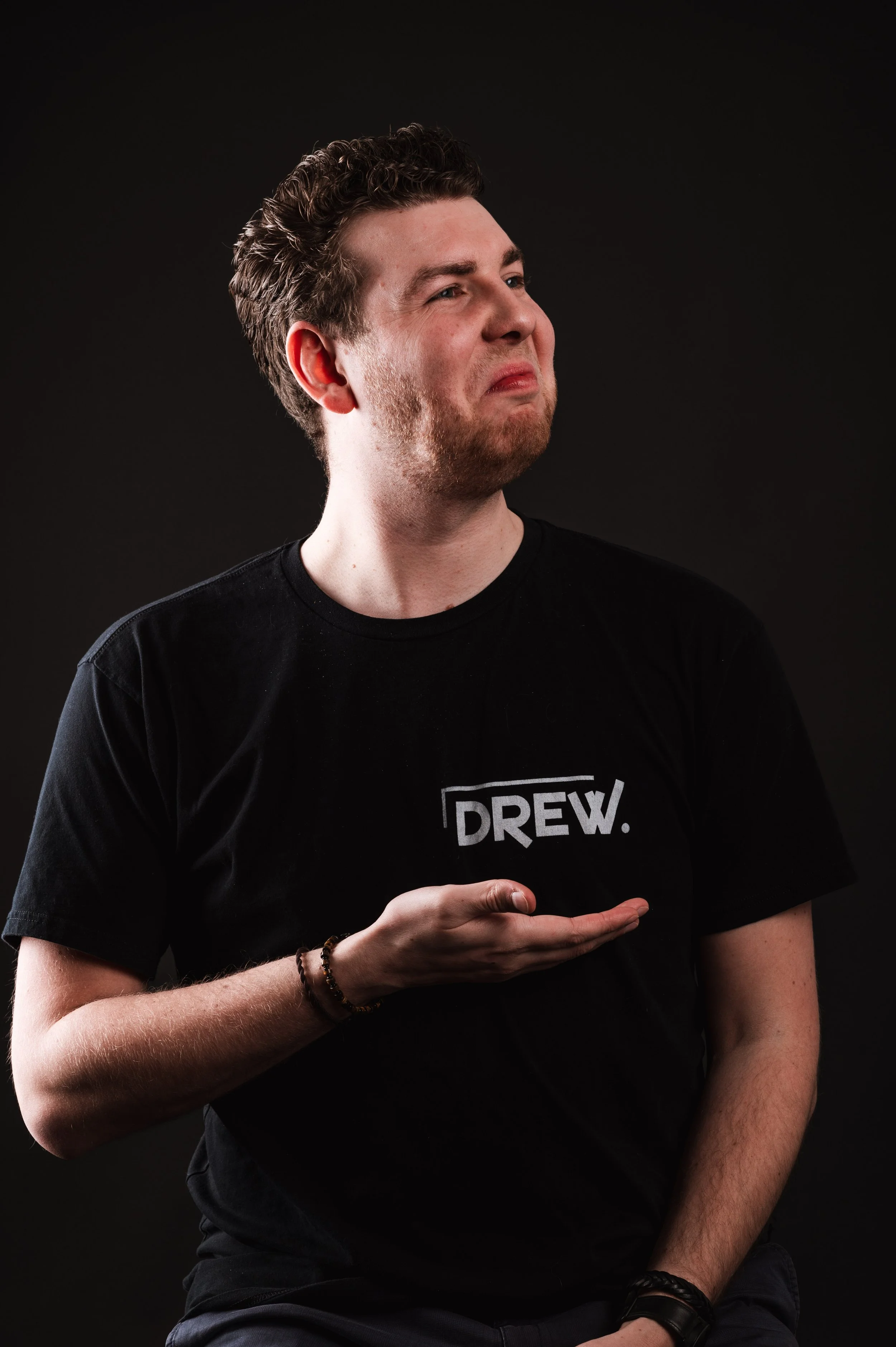 Man in a black T-shirt with 'DREW' printed on it, making a humorous expression and holding his hand out.