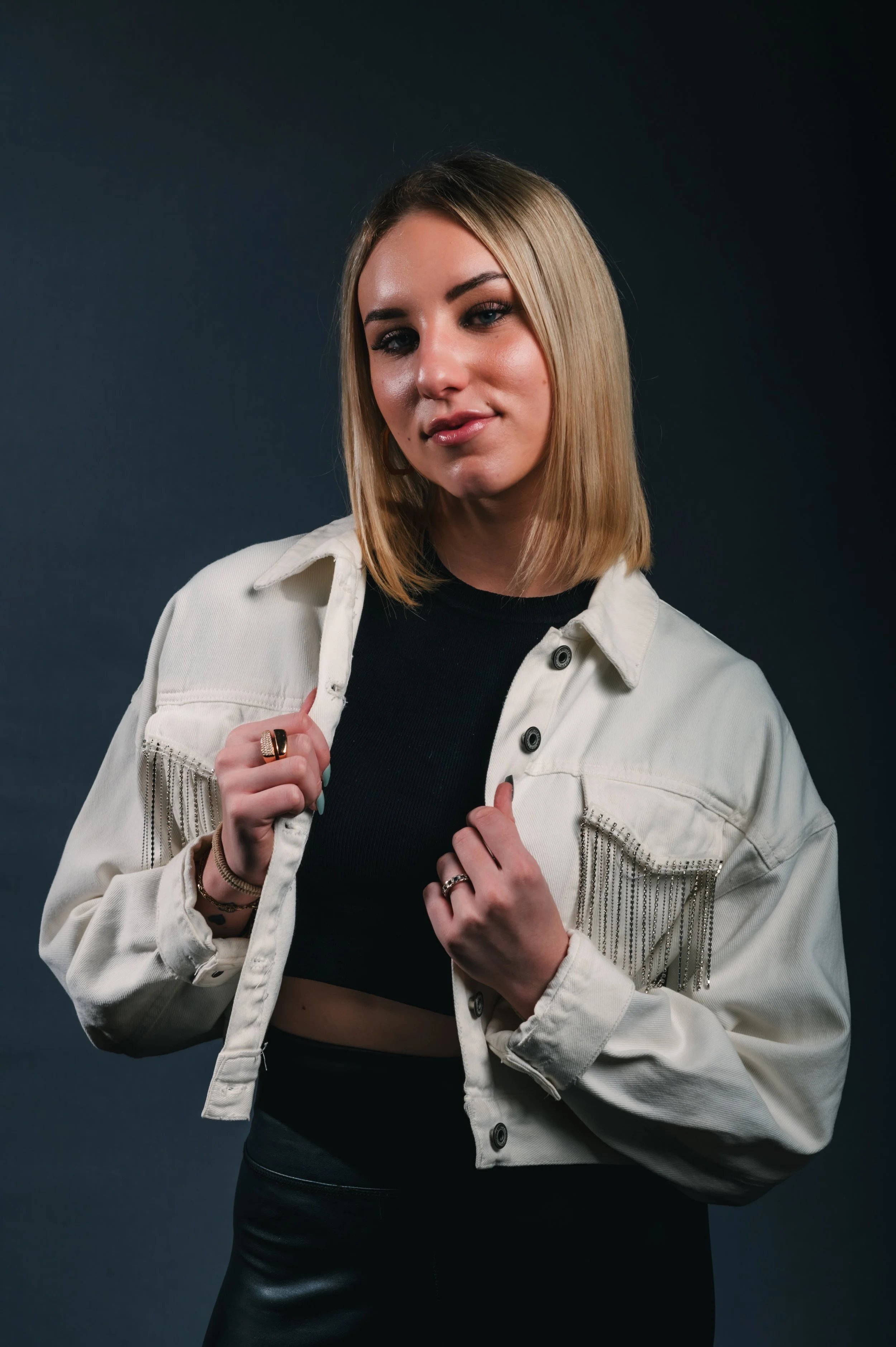 Woman in white jacket with fringe detail and black top, against a dark background, posing confidently.