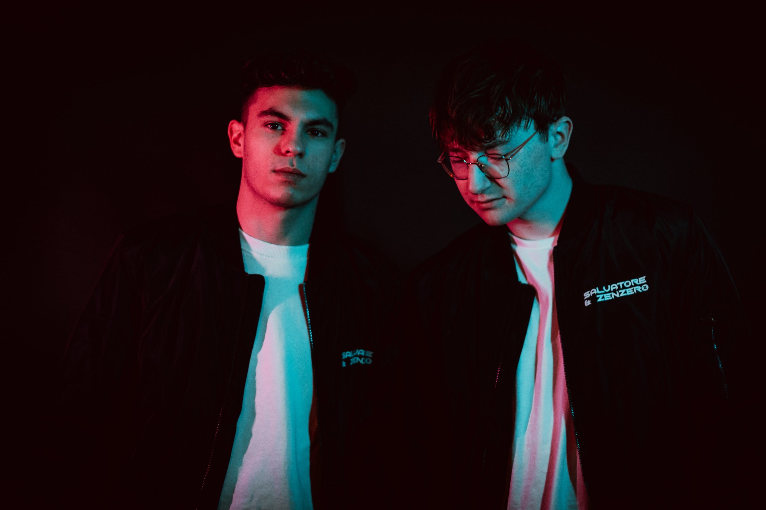 Two young men standing together, both wearing black jackets and shorts, one in mint green and the other in red. Both have surprised facial expressions.