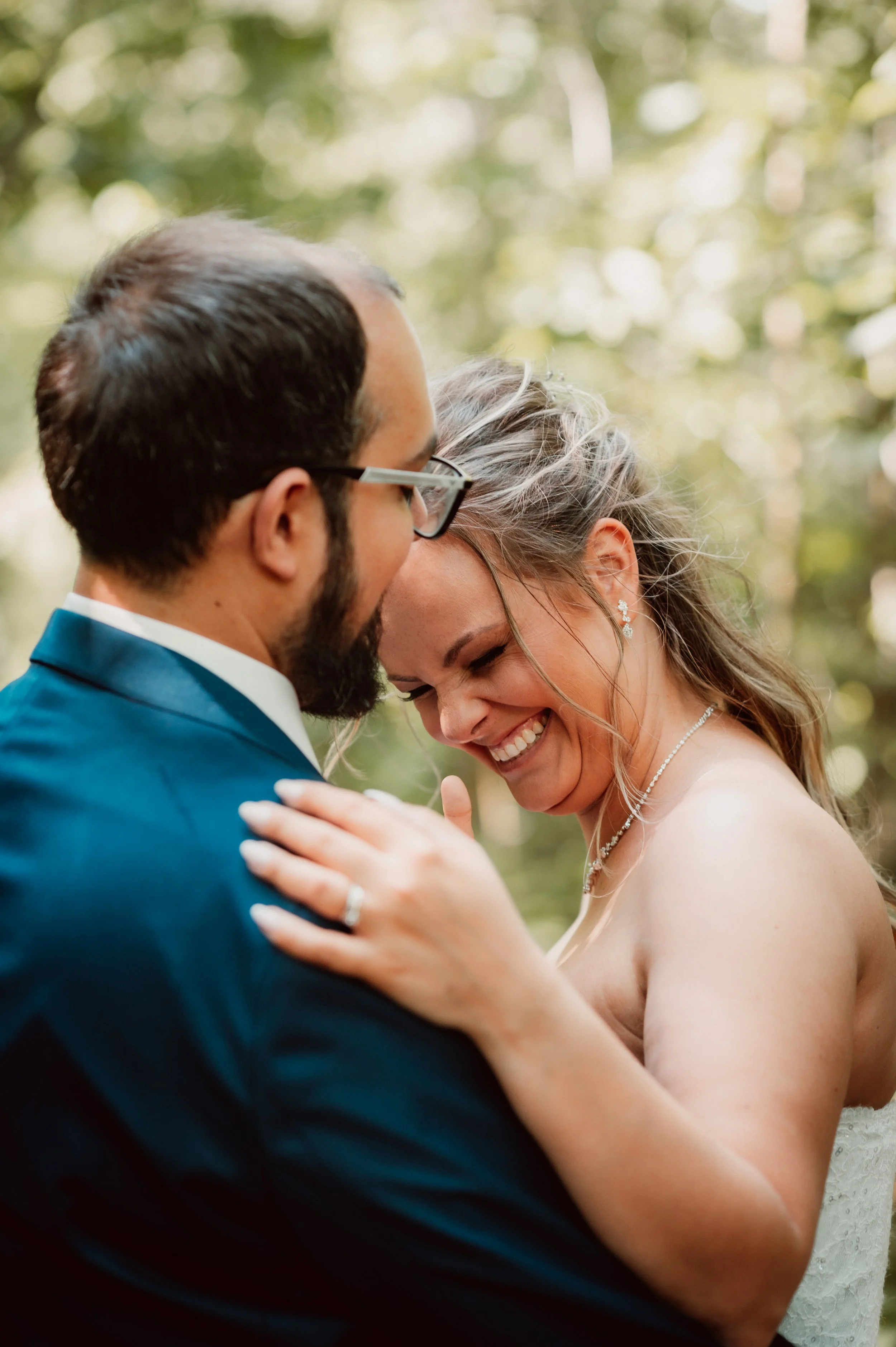 Bride and groom sharing a joyful moment outdoors, woman wearing a wedding dress and jewelry.
