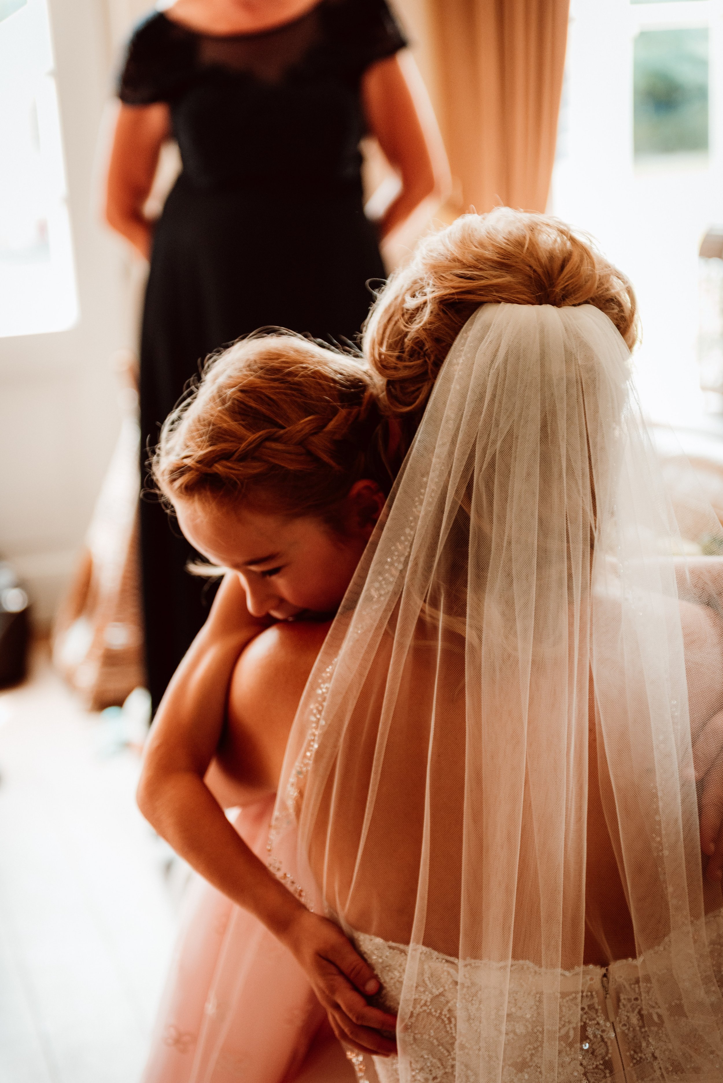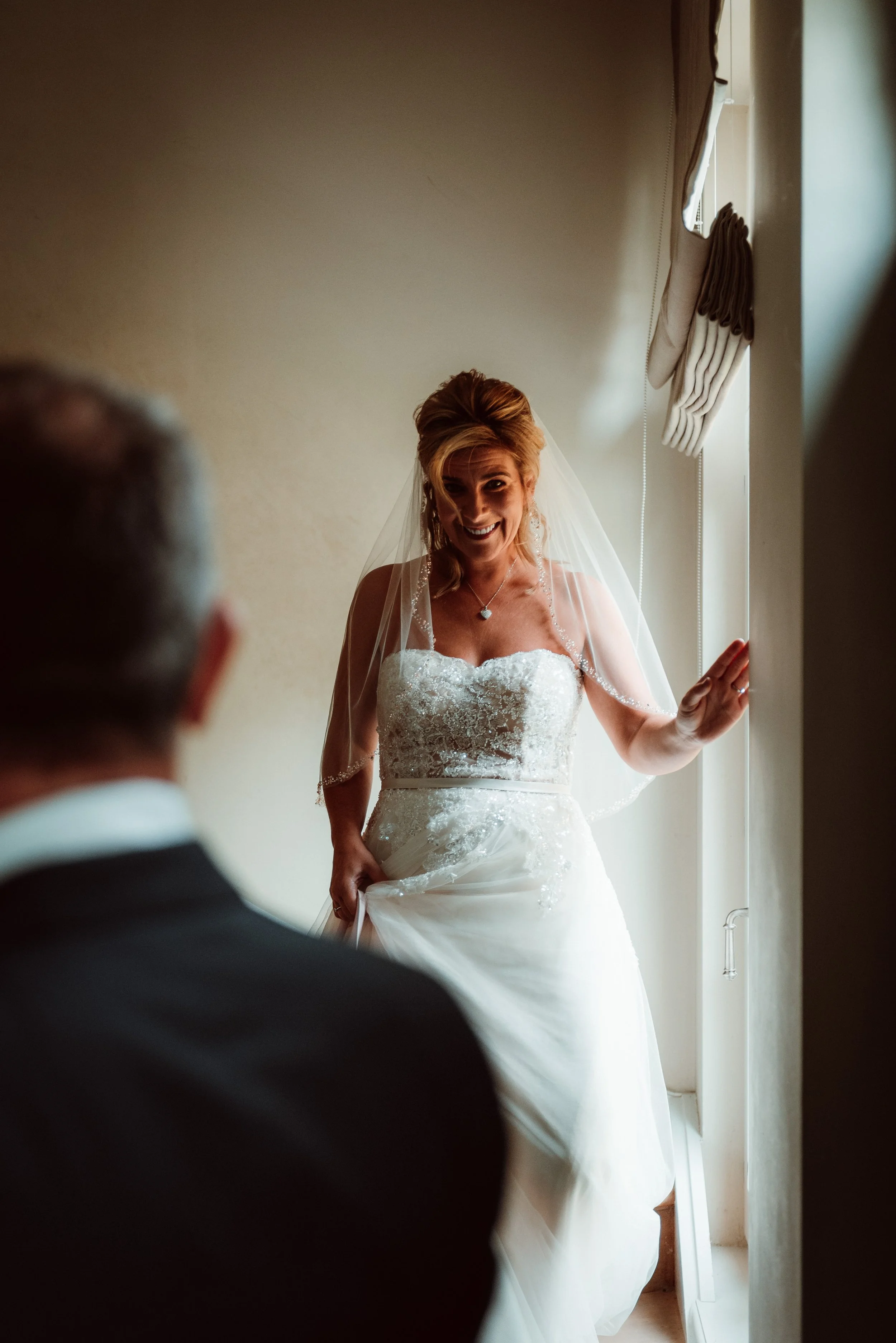 A bride in a white wedding dress and a groom in a blue suit standing by a river, embracing and smiling at each other.