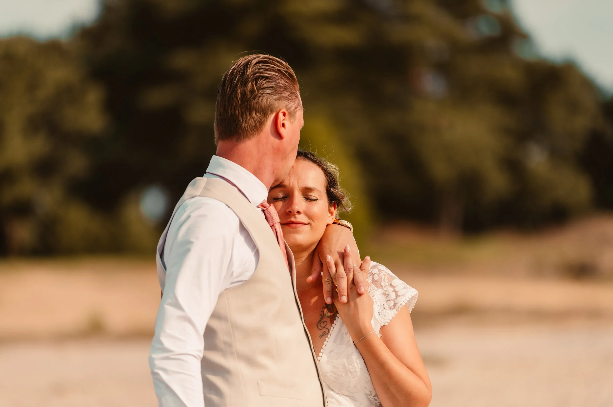 Couple in wedding attire embracing outdoors, smiling with natural background.